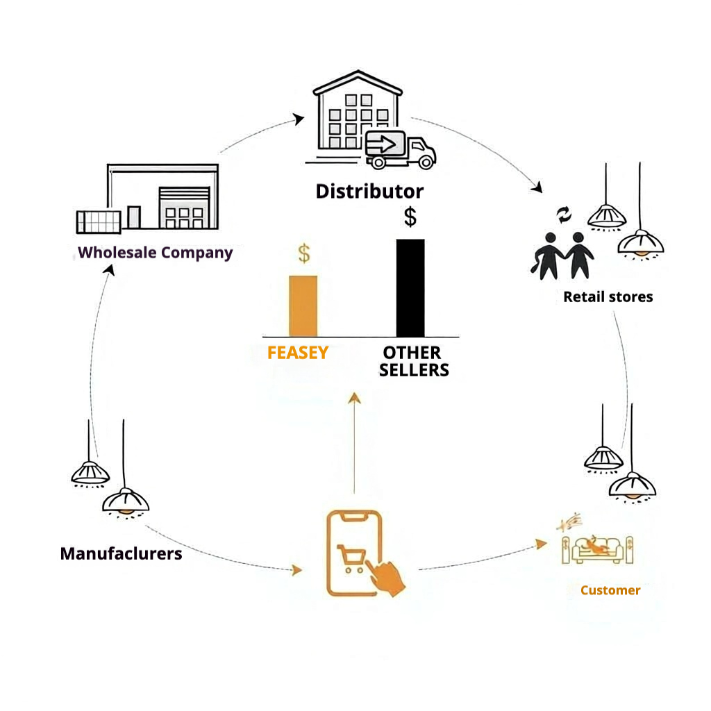 In traditional trade, intermediaries often drive up prices and complicate after-sales service. At Feasey, all our lighting fixtures are produced in-house and shipped directly through trusted local carriers. This streamlined process ensures superior quality, reduces the risk of damage, and delivers a dependable after-sales experience—without unnecessary middlemen.